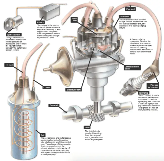 The first two types of ignition systems, the breaker point system and the electronic system, are both distributor-based, unlike the other two distributorless systems. So let’s learn the basics of how a distributor-based system works.