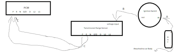 Pour vérifier la cause exacte du DTC, il suffit de vérifier la tension aux points A, B et C. S’il y a une tension en A et B mais pas en C, suspectez un capteur de plage défectueux. S’il y a une tension au niveau de C, un câblage court-circuité ou, selon mon expérience, en de rares occasions, un PCM défectueux. S’il y a une tension en A, vérifiez uniquement les fusibles.