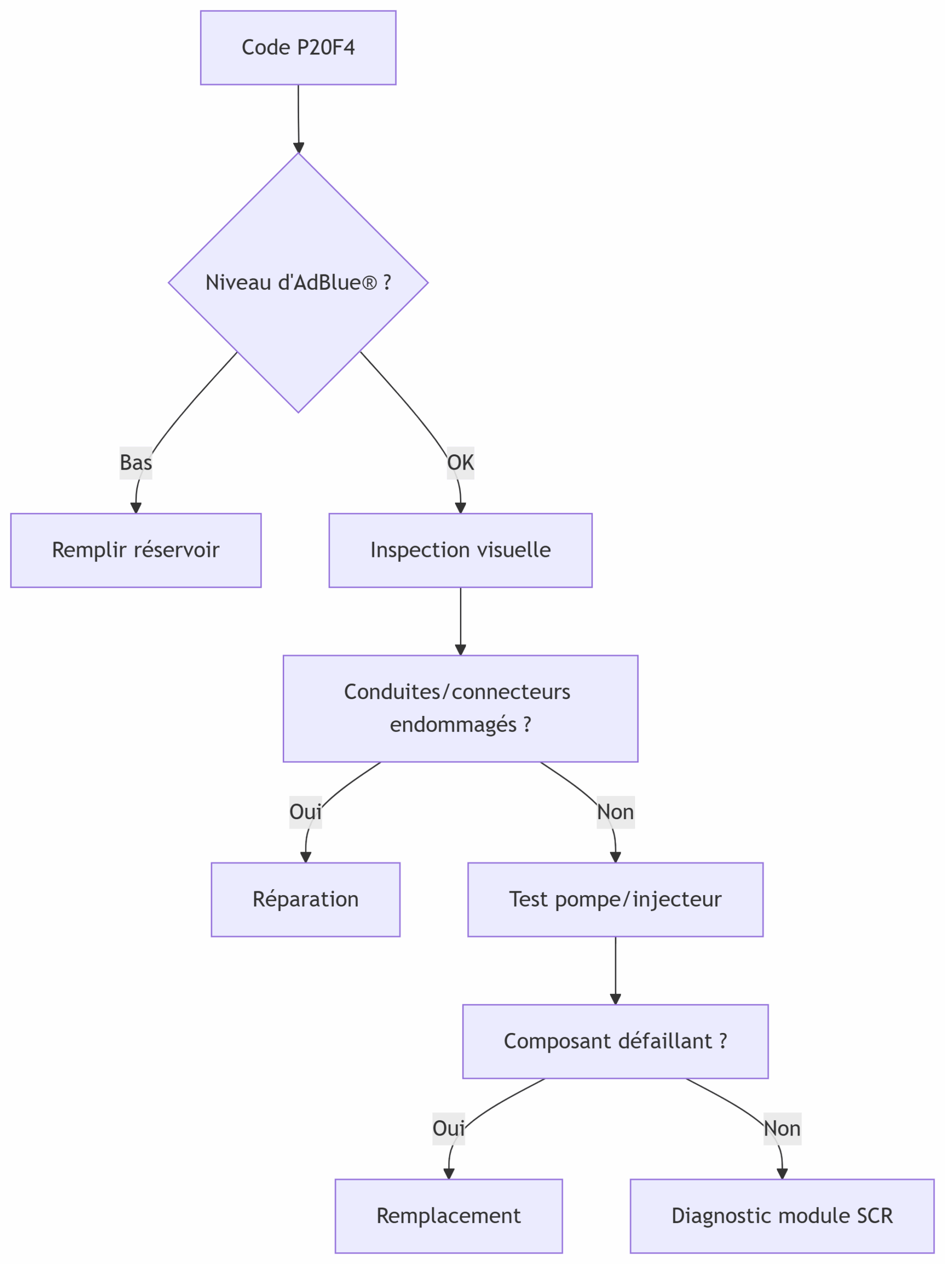 Le P20F4 indique que le débit de réducteur (AdBlue®) est inférieur aux attentes du système SCR (Réduction Catalytique Sélective). Ce liquide est essentiel pour réduire les émissions de NOx sur les véhicules diesel.