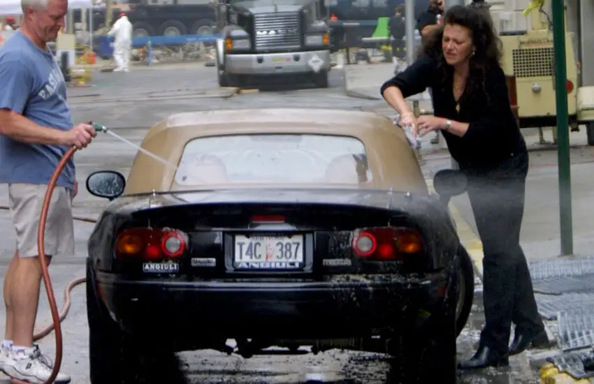 Das am 24. September 2001 aufgenommene Foto – nur zwei Wochen nach den 9/11-Anschlägen – zeigt tatsächlich die Überreste des World Trade Center South Tower im Hintergrund. Die beiden Personen waschen nicht nur den städtischen Staub von ihrem Roadster, sondern beseitigen die Rückstände des Terroranschlags, der das Gebäude zerstörte und etwa 3.000 Menschenleben forderte.