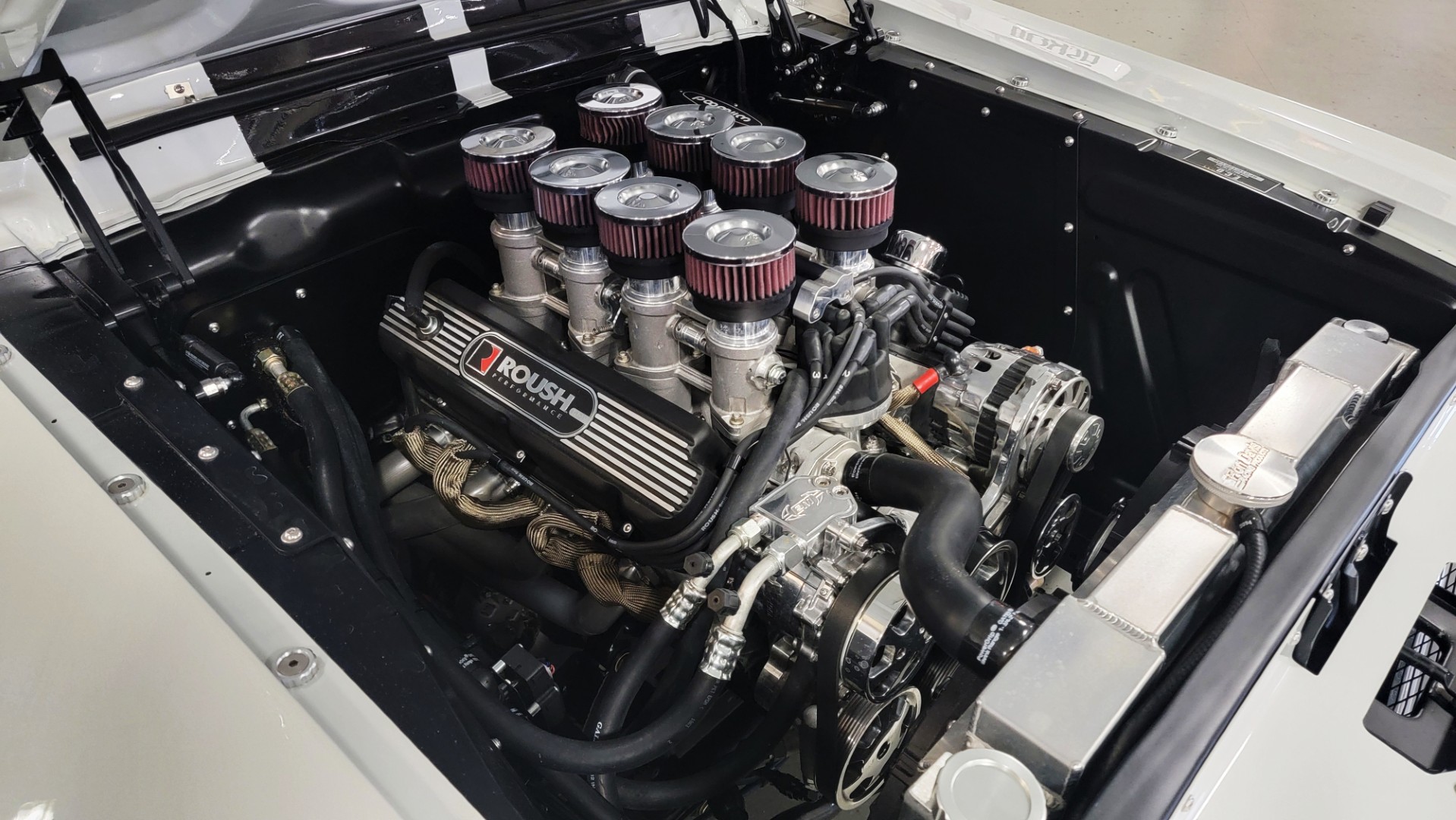 Este chasis incorpora una suspensión delantera independiente, un eje trasero Ford de 9 pulgadas, frenos Baer de 11 pulgadas en las cuatro ruedas y una configuración trasera de cuatro barras paralelas. El cliente que configuró el Ghost optó por un V8 Roush 347 IR, un bloque Dart Sportsman sobrealimentado a 347 pulgadas cúbicas y alimentado por una configuración EFI de “8 stacks”. Desarrolla una potencia modesta de 465 caballos y un par motor de 425 lb-pie, pero su sonido es absolutamente único.