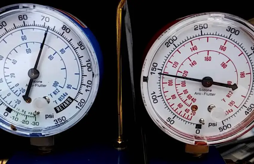 Las lecturas de presión en el lado de baja deberían ser de 25-30 psi y en el lado de alta de 200-250 psi. Sin embargo, si el lado de baja del AC está alto y el lado de alta está bajo, por ejemplo, 100 en baja y 150 en alta, podría indicar un problema en alguno de los componentes internos.