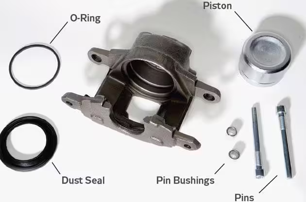 El siguiente paso del desmontaje del pistón de freno es limpiar la pinza. El kit del pistón incluye una junta para el cilindro del pistón, así como un pasador de retención y un fuelle de goma antipolvo.