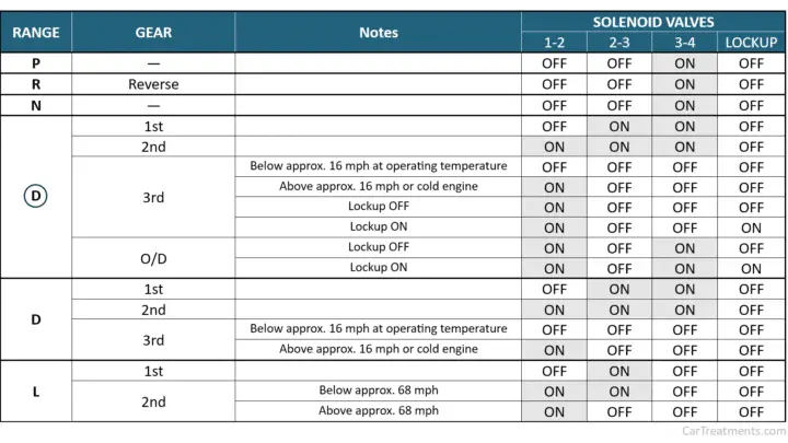 Puedes consultar una tabla simple del solenoide de cambio de marchas y ver cuán complicado es el funcionamiento del solenoide entre las velocidades: