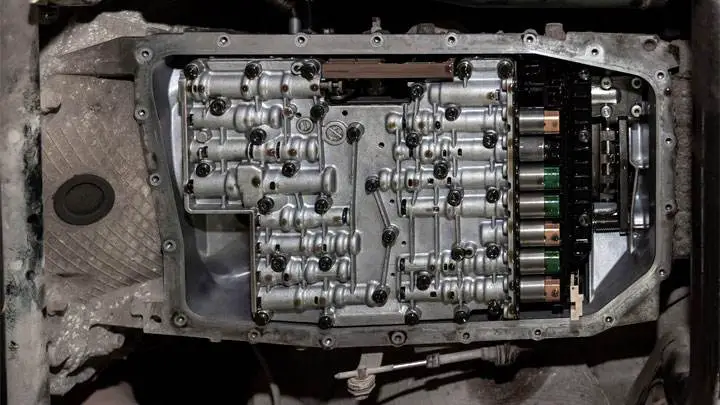 La presión hidráulica creada por la bomba llena el convertidor de par y está disponible para el “cuerpo de válvulas” como “presión de línea”. Este cuerpo de válvulas generalmente es de aluminio y está atornillado al cárter de la transmisión con una placa intercalada entre dos juntas que tienen muchos agujeros pequeños.