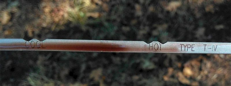 まず、トランスミッションフルード自体が健全であることを確認してください – 透明で、赤またはピンク色であり、暗い色合いや強い異臭がないこと。次に、フルードレベルがどこにあるかを確認します。