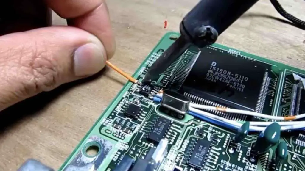 • Les fils à souder pour connecter nos ordinateurs aux puces sont une méthode utilisée pour connecter directement les puces. Un clip à puce pourrait simplifier la programmation ; cependant, établir un contact direct était trop difficile, ce qui m’a amené à utiliser des fils à souder à la place.