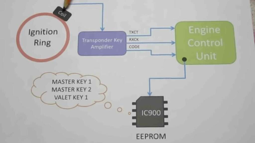 Lorsque vous placez la clé dans sa bague d’allumage, une bobine intégrée capture un signal RFID et le transmet à un amplificateur de clé à transpondeur , qui le décode pour le transmettre à l’ECU ; L’ECU dispose d’une puce EPROM qui stocke les valeurs clés ; après l’appariement, la voiture peut démarrer.