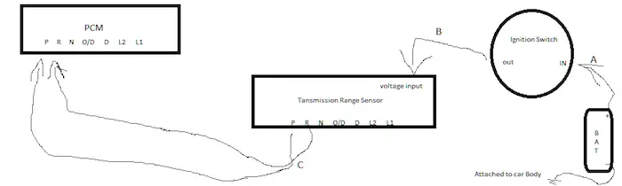 Чтобы определить точную причину DTC, просто проверьте напряжение в точках A, B и C. Если напряжение есть в A и B, но не в C, подозревайте неисправный датчик диапазона. Если напряжение есть в C, возможно, короткое замыкание проводки или, по моему опыту, в редких случаях неисправный PCM. Если напряжение есть в A, проверьте только предохранители.